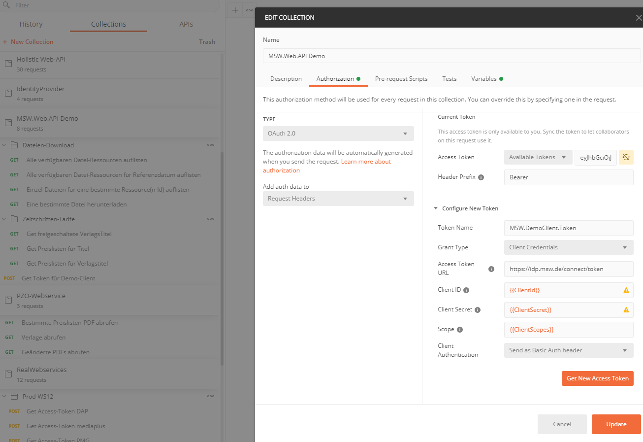 • Abrufen eines Zugriffstokens beim Identity Provider Endpunkt https://idp.msw.de/connect/token mit den zur Verfügung gestellten Credentials